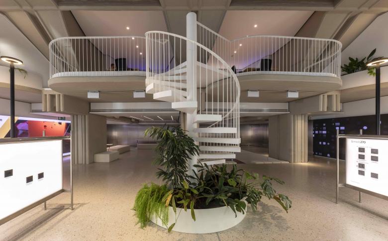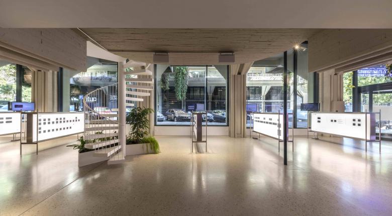 Un proyecto en un edificio histórico de Fernando Higueras, la reforma del local para albergar las oficinas y showroom de Simon nace de la necesidad de poder contar con ambos programas en un mismo espacio que facilite la gestión y uso de ambos, a la vez que se proyecta un gran espacio para el público con visión de futuro y capaz de convertirse en un referente en el sector, y en particular, en la ciudad de Madrid. La planta baja del local está destinada a un uso más público, mientras que las plantas sótano y entreplanta buscan una mayor privacidad.