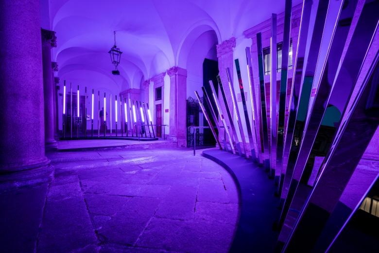 On either side of the doorway, a crown of structural light-beams open up, each one at different heights, visually amplifying the sequence of the 17th-century portico that serves as the setting for the installation. The result is a sculptural work that combines various elements, including light, sound and movement, in direct dialogue with people and with the space. The light beams create relationships, building ‘bridges’ between people. The light reacts to the presence of visitors and at the same time interprets the way they relate to each other. Through a ‘transsensorial’ mechanism, a light and musical score is created that is not only closely related to mass and volume, and thus to the number of visitors, but also becomes the driving force behind the installation. The result is an original and unique choreography of light and sound, which further enriches the visitors’ emotional journey.