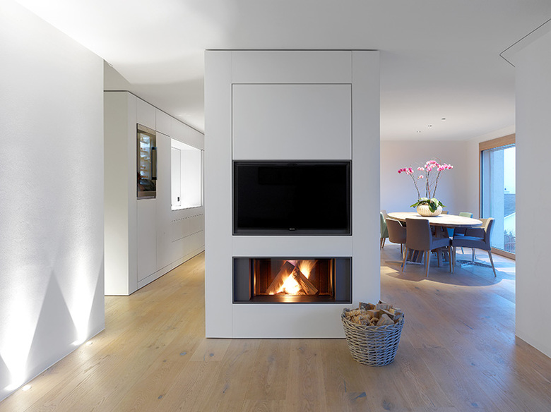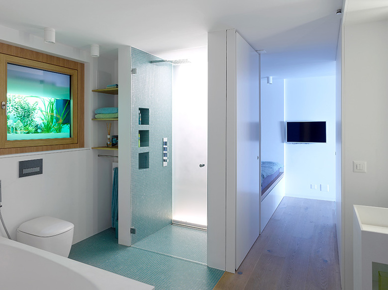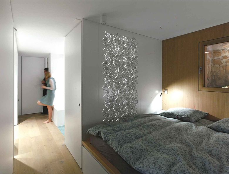 Ein zentraler Kern mit mehreren Funktionen, wie Küche, Badezimmer und Ankleide, bildet einen neuen Raumteiler, um den sich die ganze Wohnung dreht. Es entsteht eine offene Badelandschaft mit einer Schlafnische für die Eltern. Diese ist anhand von Schiebtüren abtrennbar. Die Oberflächen werden schlicht gehalten, die Farbgebung entsteht hauptsächlich durch die Materialwahl. Ausnahme sind die blauen Glasmosaike des Badezimmers. Diese verleihen der Zone eine mediterrane Stimmung und Frische. Das in den Lichtschacht eingebaute Aquarium gibt dem Ganzen einen surrealen Touch.