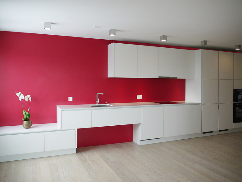 Die himbeerfarbige Rückwand der Küche verleiht den allgemeinen Räumen Lebendigkeit.