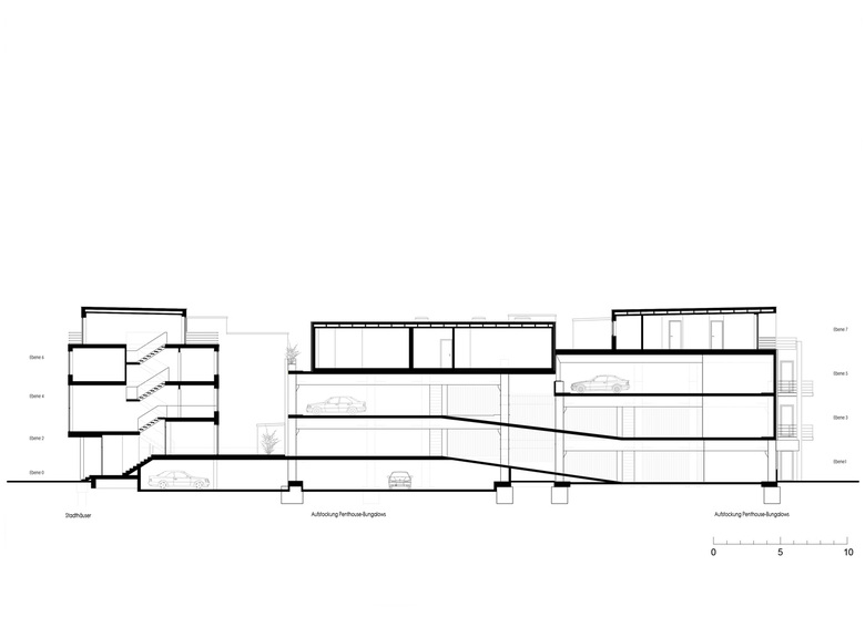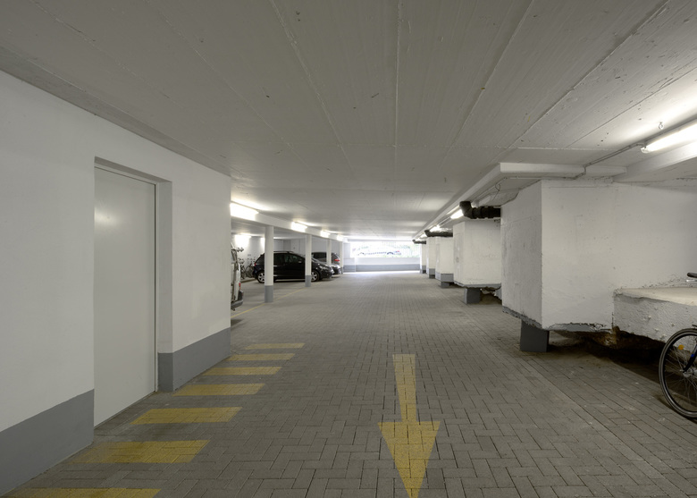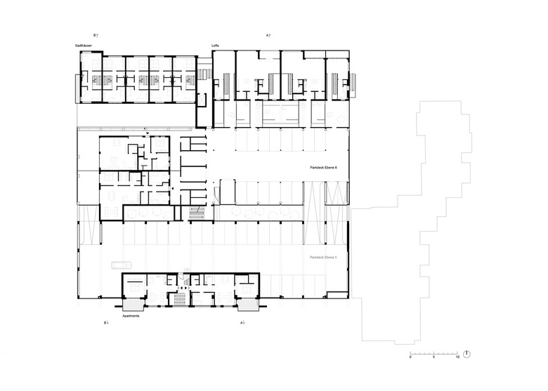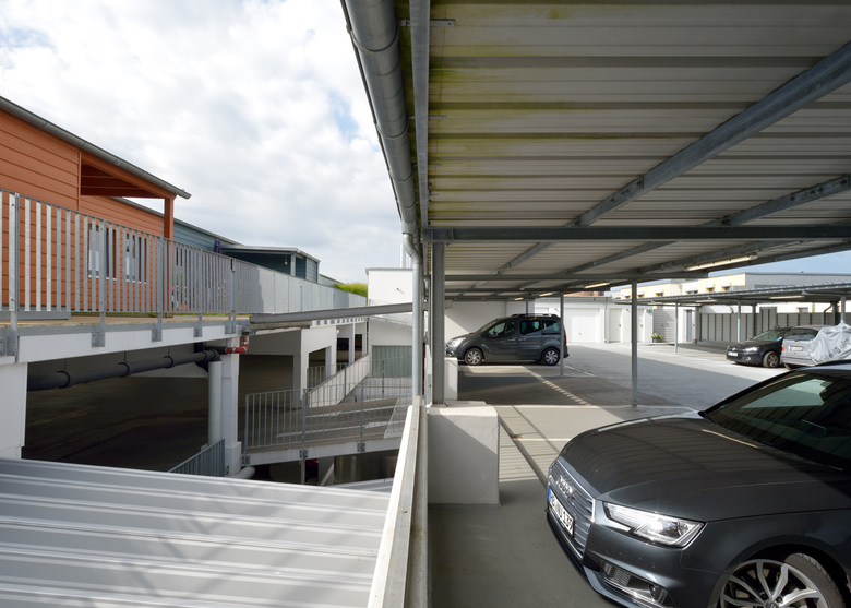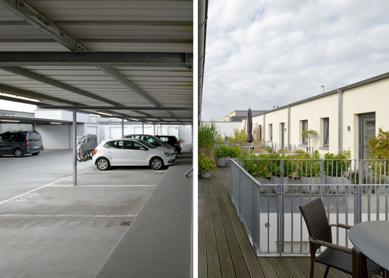 Das allgegenwärtige Nebeneinander von Wohnen und Parken und der Einbezug von prägenden Elementen des Parkdecks in den insgesamt 22 Wohnungen schafft ein interessantes gestalterisches Spannungsfeld. Die zweigeschossigen Lofts sind integriert in das Parkdeck und verfügen über Südterrassen auf den oberen Geschossen sowie visuell abgetrennte Carports. Die Bungalows auf zwei Ebenen sind über Gartenwege mit Vorgärten, Schuppen und Pforten erschlossen. So entsteht inmitten des alten Parkhauses eine beinahe dörfliche Gebäude- und Wohnstruktur.