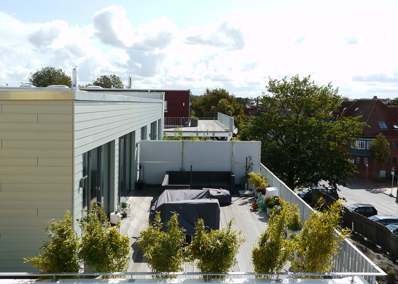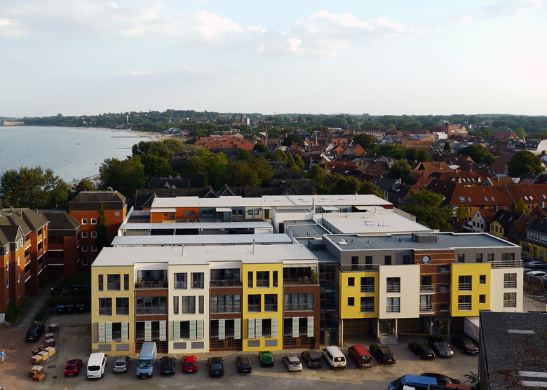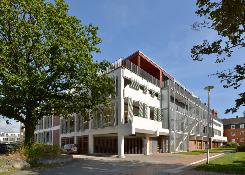 Mit verschiedenen Maßnahmen haben wir die Integration des Parkhauses in das Quartier mit seiner lebendigen Vielfalt an Wohn- und Gewerbehäusern erreicht. Die seitliche Erweiterung des Gebäudes umfasst Stadtwohnungen und Gewerbeeinheiten. In einem Teilbereich des Parkhauses wurden Flächen zu modernen Lofts entwickelt, die direkt über Carports auf dem Dach des Parkhauses erschlossen sind. In aufgestockten Teilen entstanden daneben Bungalows mit Aussicht über die Stadt und die Bucht. Die wegfallenden Parkflächen wurden durch das Ausgraben einer zusätzliche Ebene unter dem Gebäude kompensiert. Für die Versorgung des gesamten Quartiers wurde eine Energiezentrale der Stadtwerke in das Parkhaus integriert.