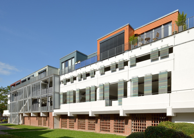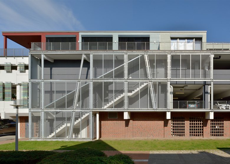 Die Parkbereiche sind in der Sockelzone mit gelochtem Ziegelmauerwerk und in den oberen Ebenen mit offenen Brüstungen und bunten Aluminiumlamellen verblendet. Diese horizontale Gestaltung tritt in den Dialog mit den vertikal gegliederten Fassaden der Lofts. Die Lofts sind mit Loggien, Materialien und Farben individuell gestaltet. Auch die Fluchttreppe auf der Südfassade verbindet durch die davor gestellte Streckmetall-Einhausung Parkhaus und Bungalows.