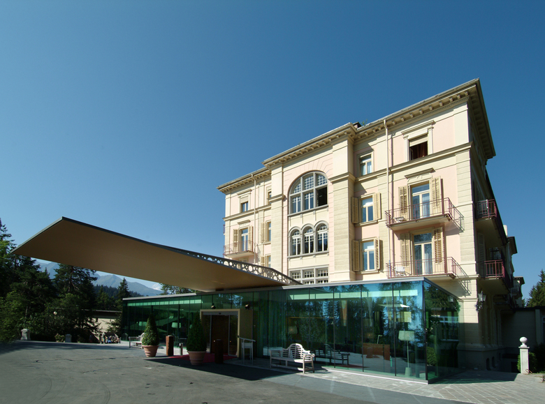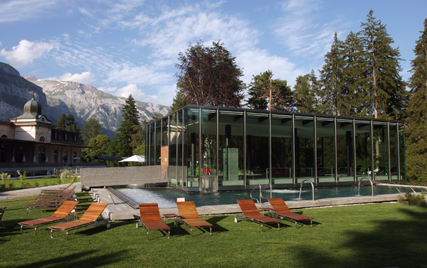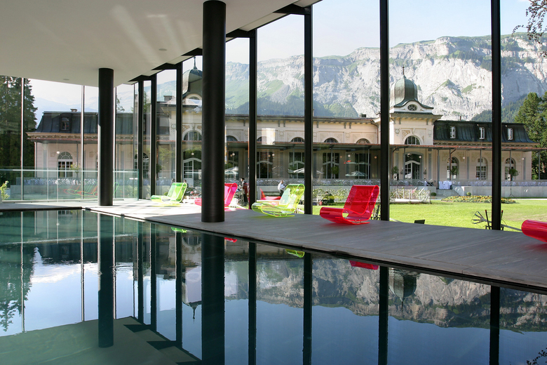 Der Pavillon, das Gesellschaftshaus aus der Jahrhundertwende, wurde vom Schwimmbad aus den 60er Jahre befreit. Die Südfassade mit grosszügiger Flanier- und Restaurant-Terrasse wird wieder wie einst zum Zentrum des GrandHotel-Lebens. Anstelle des in die Jahre gekommenen Schwimmbads entstand ein leichter und völlig frei