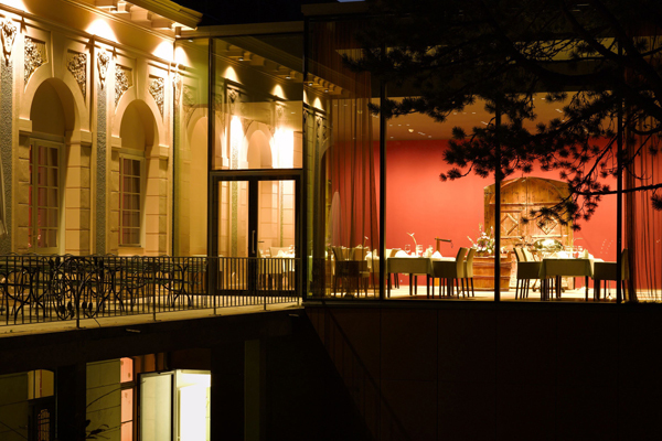 Dem historischen Bau vorgelagert, anstelle des aus den 60-er und 80-er Jahren stammenden Windfanges, befindet sich nun der neue Empfang. Auf Vorfahrtsniveau ist ein filigraner, schlichter Glaskubus entstanden.