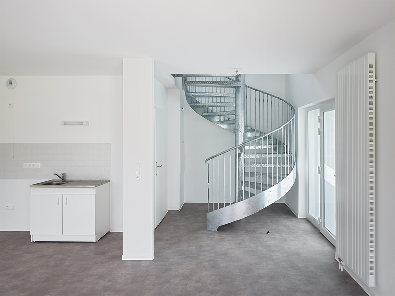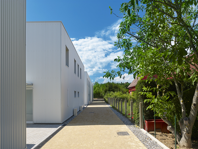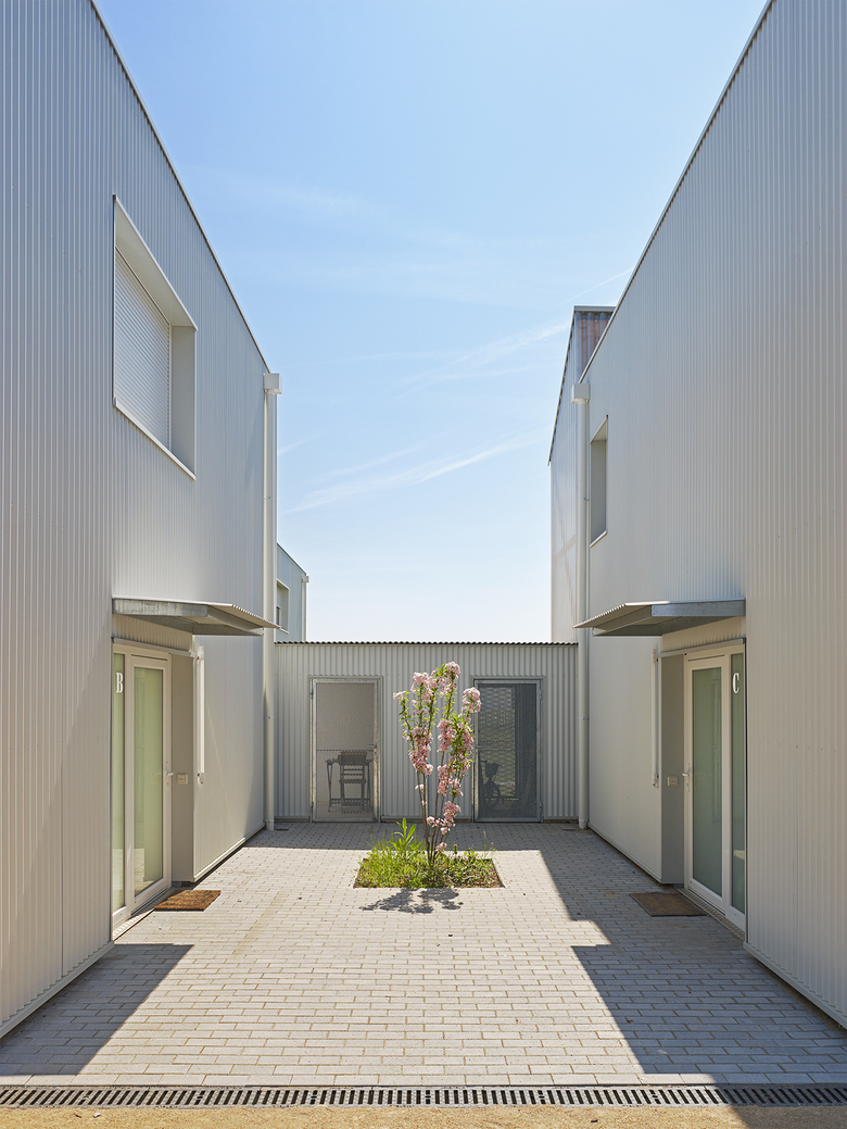 Die Typologie der Häuser vereint Doppelhaus mit Reihenhaus und bildet mit dazwischen geschalteten ortstypischen Schuppen jeweils für zwei Parteien einen Innenhof aus, über den die Erschließung erfolgt. Durch die sich gegenüber liegenden Eingänge der Häuser erfüllt der Hof gleichsam einen sozialen Aspekt und ermöglicht Begegnung der verschiedenen Bewohner aller Altersgruppen, die ihn für verschiedenste gemeinsame Aktivitäten nutzen können.