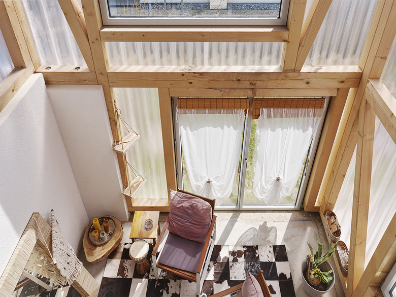 Für die Konstruktion wurde besonderer Wert auf robuste und nachhaltige Materialien gelegt, Stein, Stahl, Holz, Mineralwolle. Der Rohbau besteht aus Hochlochziegelwänden mit aufgelegten Betonfertigteildecken. Eine mineralische Außendämmung wird von industriellem Metall-Wellplatten umschlossen. Die Holzkonstruktion der vorgestellten Wintergärten erinnert an die traditionelle