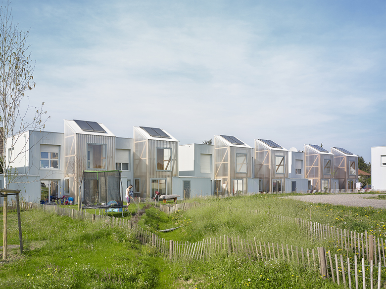 elsässische Bauweise, Fachwerk und Erker, und bindet die Häusergruppe in den Ortskontext ein. Der ephemeren Hülle der Wintergärten aus eine gewellten Doppelsteg-Acrylplatte hat das Ensemble den liebevollen Spitznamen ‚Pierre de lune’ zu verdanken.