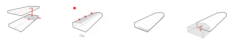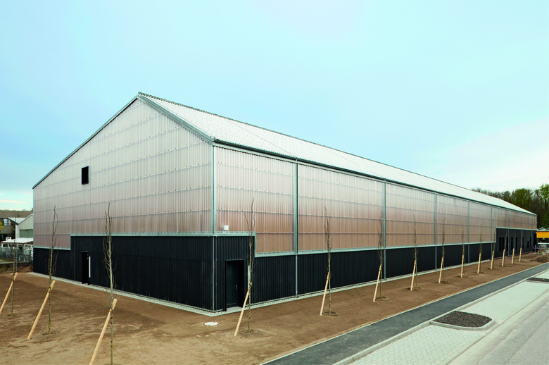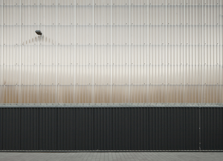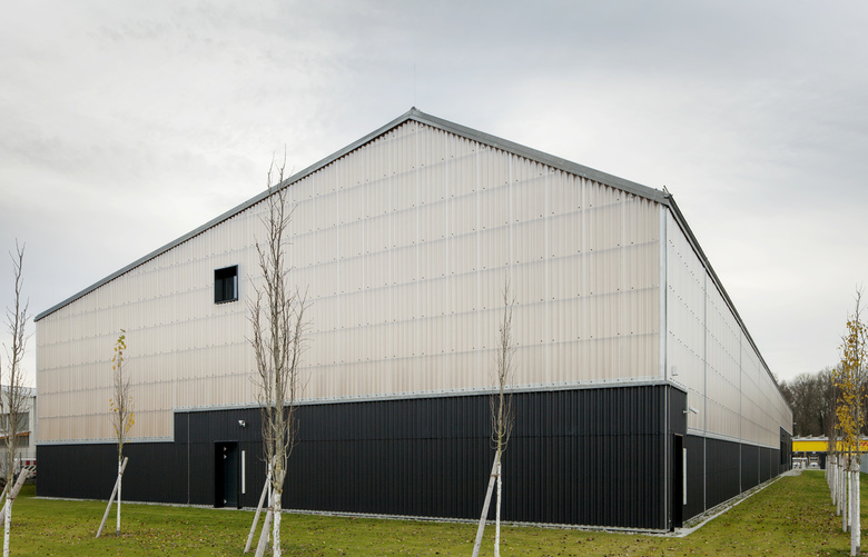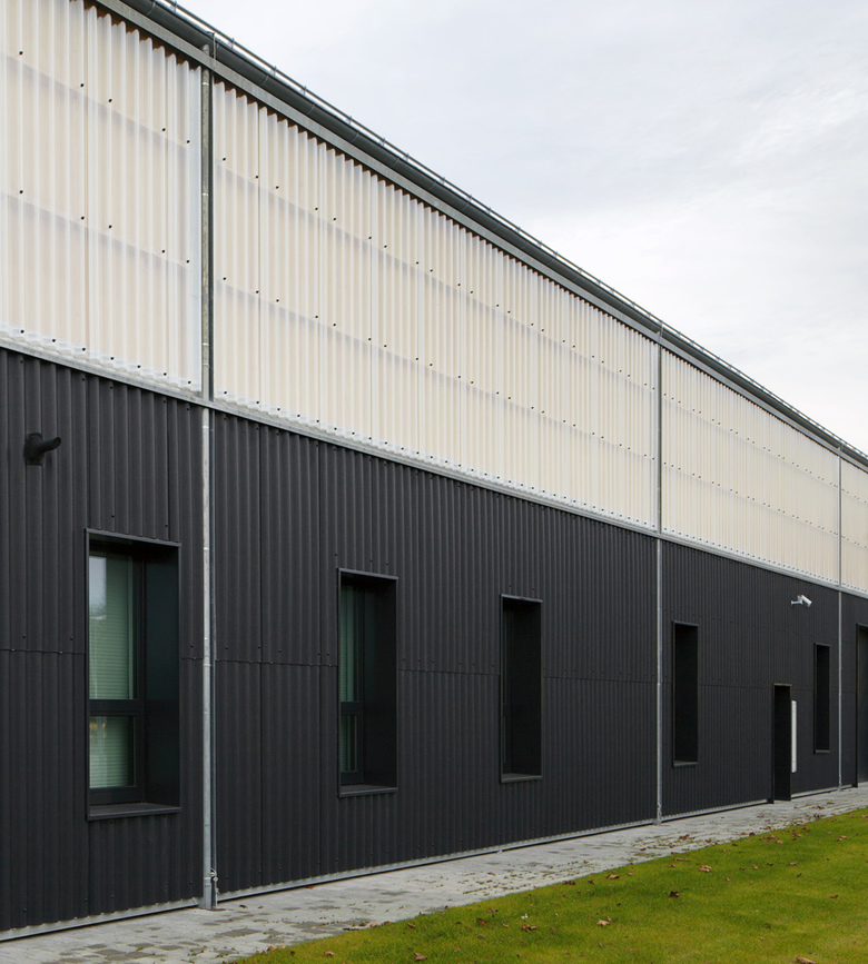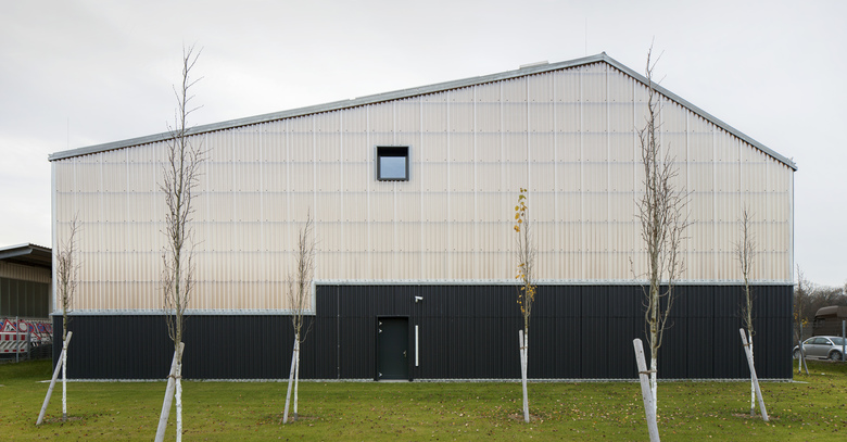 Da das Gebäude durch seine Massivbauweise überall nach außen die Anforderung F90 erfüllt, konnte die Fassadengestaltung (im Rahmen des knappen Budgets) recht frei erfolgen. Vor der dicken Dämmebene, die mit Wandsparren als Unterkonstruktion aus die massiven Wände aufgebracht ist, hängt eine klar gegliederte hinterlüftete Fassade aus Wellplatten. Der Sockel wurde mit Eternit-Wellplatten bekleidet. Die oberen Fassadenbereiche, sowie das Norddach wurden mit Polycarbonat-Wellplatten belegt, die je nach Lichteinfall schillern oder den Blick auf die dahinterliegende Konstruktion freigeben. Diese sehr wirtschaftliche Alternative zum WDVS prägt das ruhige aber dennoch luftige Erscheinungsbild des fast 100m langen Baukörpers und ist im Recyclingfall nahezu komplett demontier- und trennbar. Der Bau erinnert durch die wenigen Öffnungen und die „armen Materialien“ beinahe an eine große Scheune, oder an eine Schutzhütte.
