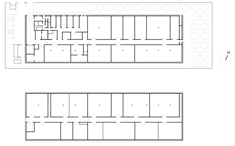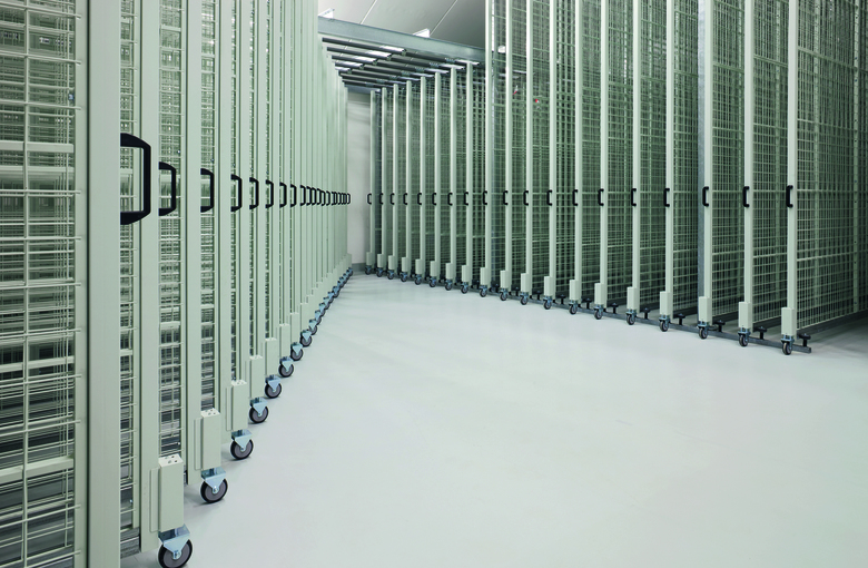 Das langgezogene Grundstück erforderte einen langgestreckten Baukörper. Die Grundrissgliederung ist äußerst einfach gehalten. Die großzügigen Depoträume selbst sind als einzelne Zellen zweiseitig entlang eines breiten Flures angeordnet. Diese Anordnung ermöglicht einerseits die Zellen mit jeweils maßgeschneidertem Raumklima auszustatten und vom Flur aus anzudienen, andererseits minimiert sie das Verlustrisiko im Brandfall, da jeder Raum von F90 Wänden umgeben ist und hält den Baukörper relativ kompakt. Die Wände sind massiv aus Mauerwerk und Beton errichtet, was die bauklimatisch erforderliche Trägheit erzeugt. Die kostbaren Objekte, die hier lagern, mögen weder Licht noch ertragen sie schwankende Temperaturen oder wechselnde Luftfeuchte.