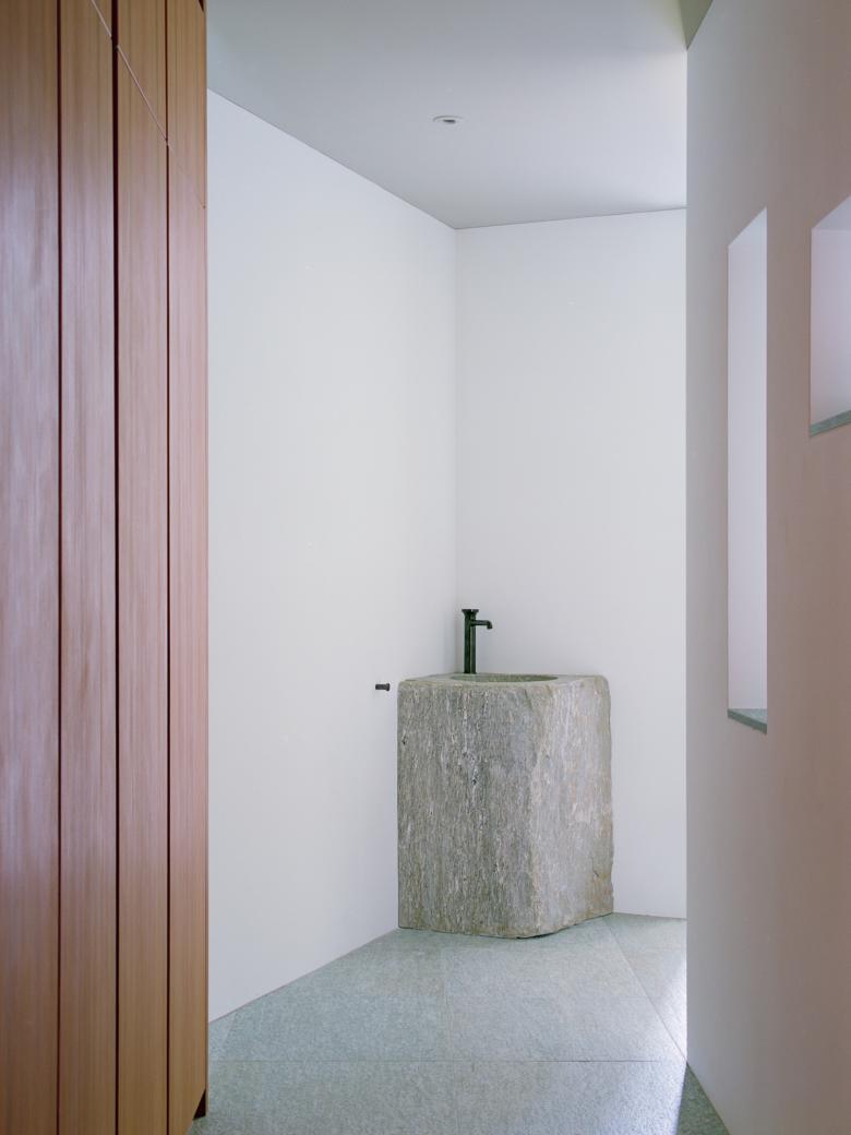 Das Wohnhaus als Massivbauweise geplant, ist als Zweischalenmauerwerk mit einheimischen Bruchsteinen verkleidet. Die alte traditionelle Bauweise ist ein wichtiges Element des Entwurfes, welche sich auf die natürliche Umgebung, auf die Tradition und die wetterbedingte Veränderbarkeit der Materialien bezieht.