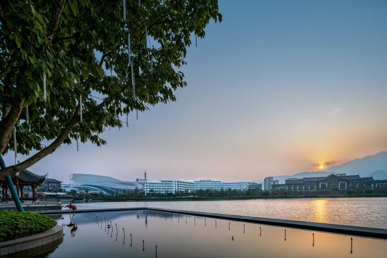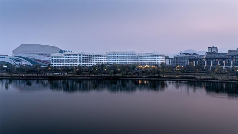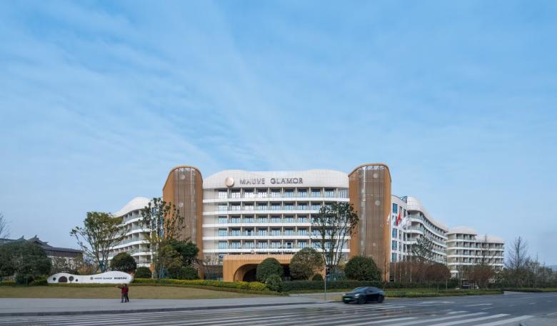 The immediate surroundings form a hotel group arranged around an artificially created lake, consisting of a 6-star hotel, a 5-star hotel, the 'Mauve Glamor' brand panda-themed hotel, a conference centre and a bar street, with a total gross floor area of around 140,000 square meters.