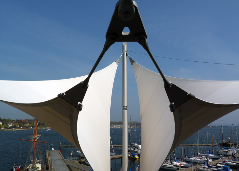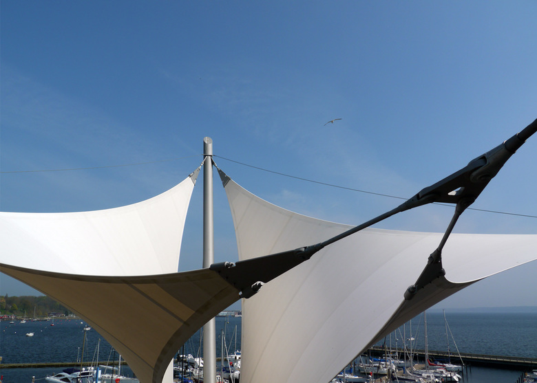 Das Gebäude öffnet sich winkelförmig zu den Kaikanten des Hafens und der Ostsee. Hierdurch entstand ein zweiseitig eingerahmter Platz, der durch ein zweiteilig symmetrisches Segel und die Kaimauern des Hafens definiert wird. Das Segel bildet durch seine spektakuläre Landmarke einen Orientierungspunkt für die Hafeneinfahrt von See und vom Land und repräsentiert den Auftakt für das neue innerstädtische Quartier am Hafen.