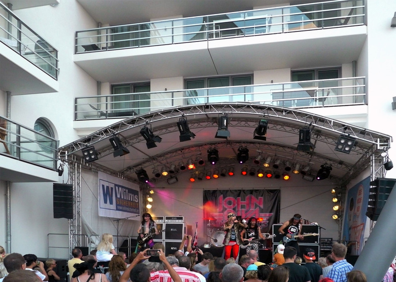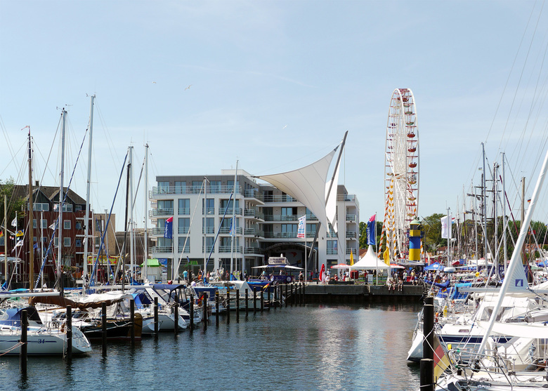 Der Platz zwischen Apartmenthaus und Hafen hat durch das darüber aufgespannte Segel ein besonderes Ambiente und kann wegen der Abschirmung der Nachbarbebauung als Ort für laute Musikveranstaltungen genutzt werden. Durch die besondere Konstruktion der vorgelagerten Balkone mit verglasten Schiffsgeländern sowie besonders ausgebildeten Fassaden wird der Schall auch vom Inneren abgehalten.