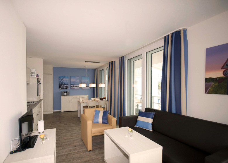In drei Obergeschossen und einem Staffelgeschoss sind moderne Ferienapartments verschiedener Größe mit Orientierung zum Wasser und der Altstadt entstanden, die über große, vorgelagerte Balkone verfügen.