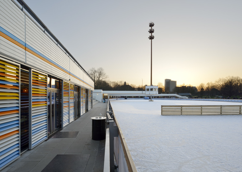 Nach Überarbeitung des Entwurfes durch rimpf Architektur wurde das Café höhengleich an die Eisbahn angeschlossen und damit ohne Hilfsmittel barrierefrei an die Anlage angeschlossen. Die zentralen Sanitärbereiche wurden komplett neu konzipiert und mit selbstleuchtenden Bildwänden mit Motiven aus Planten und Blomen zum besonderen Highlight.