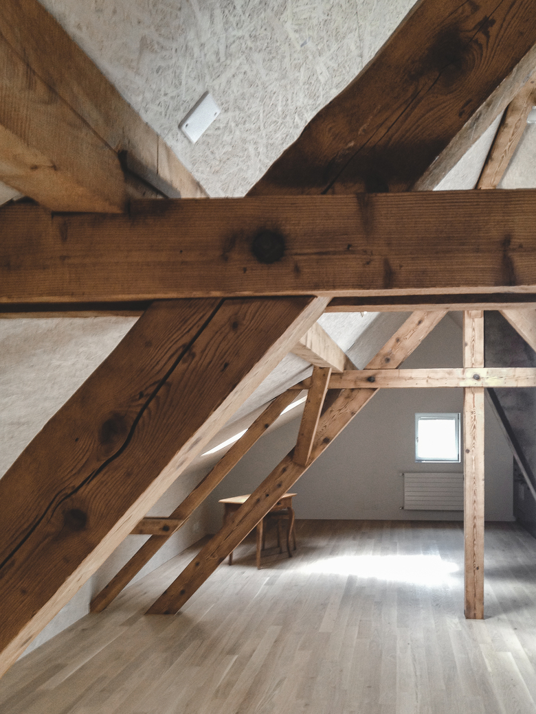 Im denkmalgeschützten Haus an der Obergrundstrasse konnten die Estriche aufgehoben werden, sodass ein grosser, offener Dachstock zu einem Ausbau zur Verfügung stand. Im Vordergrund des Eingriffs stand das Freilegen der beeindruckenden Holzkonstruktion.