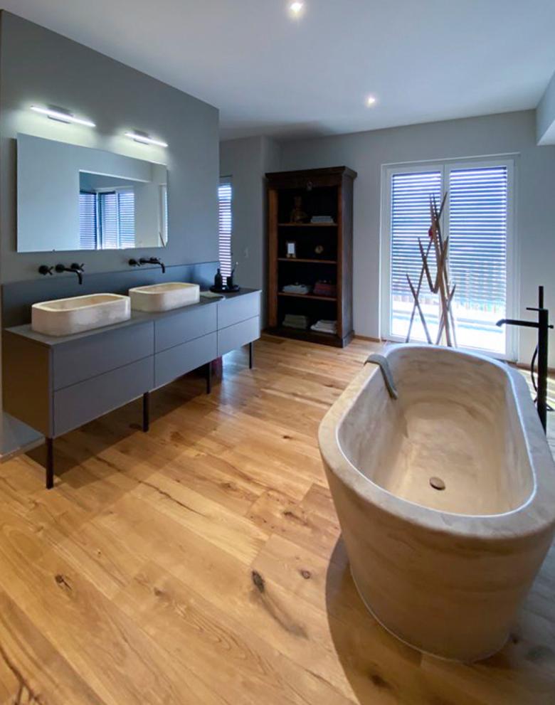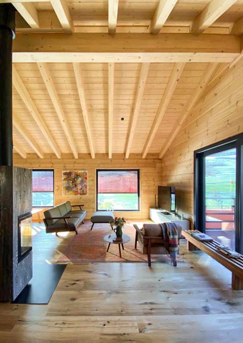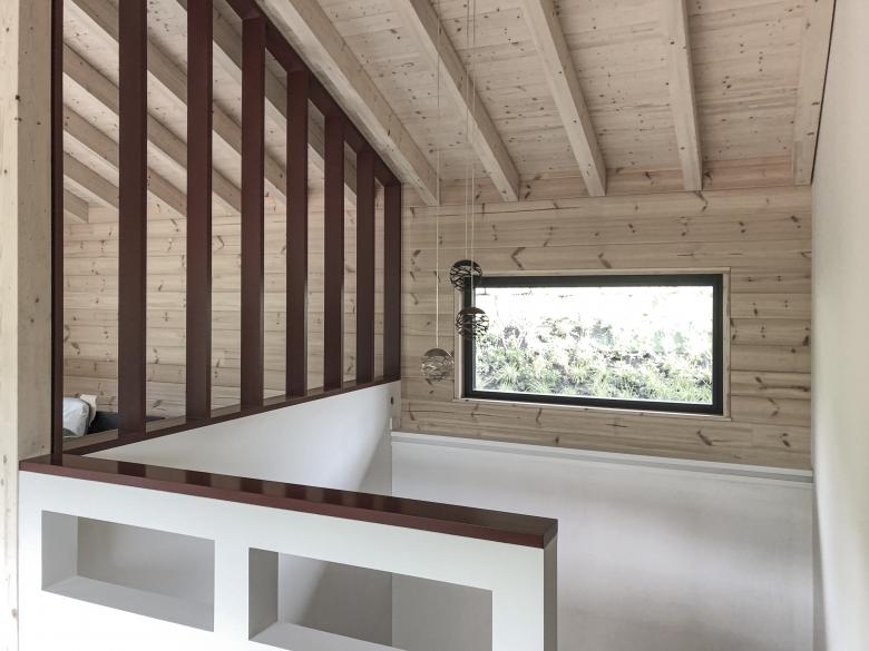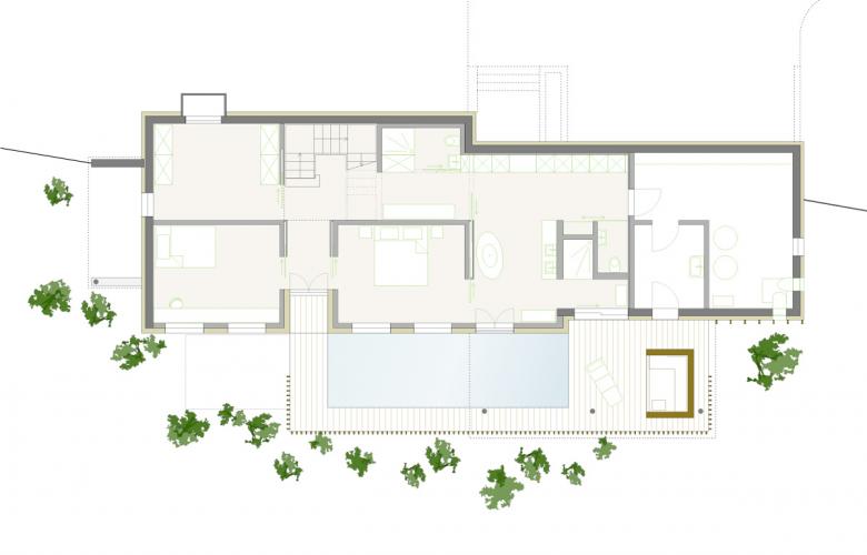 Aufgesattelt auf einem Sockel in Massivbau liegt ein langgezogener Holzbau, gegliedert in einen offenen Wohnteil und einen Remisenteil (Garage). Das Gebäude ist im Hang gestaffelt - es ergeben sich Abstufungen, welche unter Anderem als Swimmingpool genutzt werden.