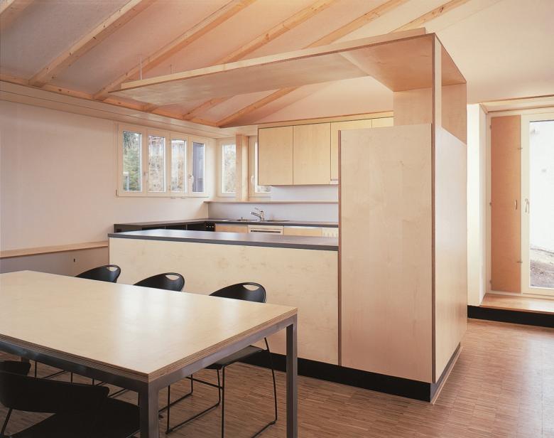 Das Einfamilienhaus, aus einem vorgegebenen Gestaltungsplan entwickelt, in schöner Hanglage am Siedlungsrand des Dorfes mit Sicht auf den Sempachersee, ist ausgeprägt gegliedert um eine entsprechende Nutzung zu erzielen. Das Gebäude besteht aus zwei Baukörpern - einem harten, nicht gedämmten, plastischen Betonkubus und einem leichten, abgesetzten Holz-Trakt. Die Schnittstelle der beiden Konstruktionsteile bildet eine Kaskadentreppe, welche die im Split-Level angeordneten Ebenen erschliesst.