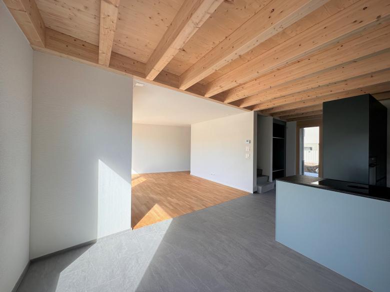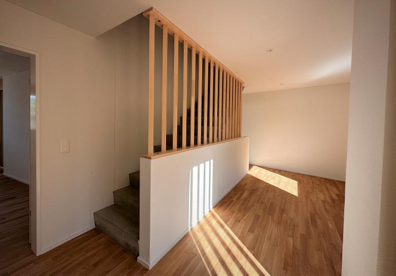 Bei diesem Objekt handelt es sich um drei Gebäude mit je drei Wohneinheiten. Viele Bauernhäuser zeichnen sich durch das Wechselspiel der Materialien - Ökonomieteil (Holz) und Wohnteil (Mauerwerk) - aus. Mit dieser Materialkombination wollte man im architektonischen Ausdruck dem Standort und der Geschichte der Gemeinde, Rechnung tragen. Auch der Grundriss zeichnet sich nicht als Rechteck aus und nimmt Bezug auf die vom Alter gezeichneten windschiefen Bauernhäuser. Das Wechselspiel zeigt sich ausserdem im Innenausbau mit Betondecken und Feinsteinzeugbelägen versus Holzbalkendecken und Parkettböden. Die Sichtelementbetontreppen nehmen Bezug auf den in früheren Zeiten verbauten Sandstein und ist natürlich auch dem Auftraggeber geschuldet. Der Grundriss mit den gespiegelten Trapezen ermöglicht es, die Flächen dort grösser zu gestalten, wo diese gebraucht werden.
