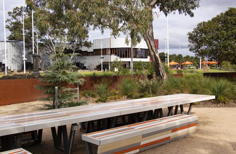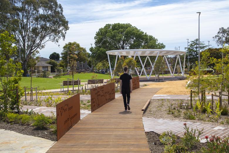 Working in collaboration with Lyon Architects on the landscape and new civic centre buildings are symbolically centred around several remnant river red gum specimens on the site. The new park spaces form new inclusive welcoming land forms and pathways that embrace the symbolic gesture, the landscape the diverse trees on the site, and the differing peoples that have come to Springvale from many lands.