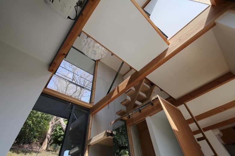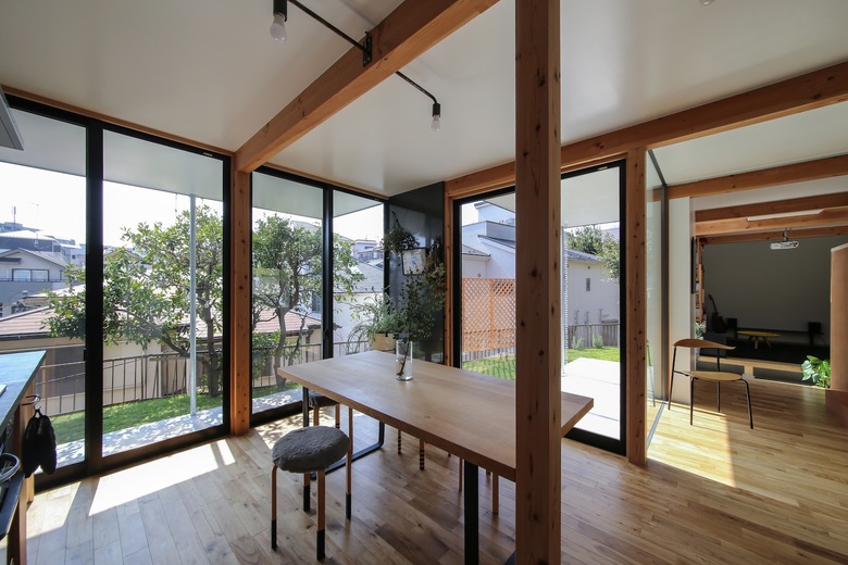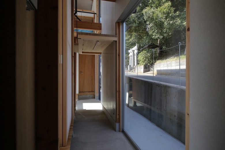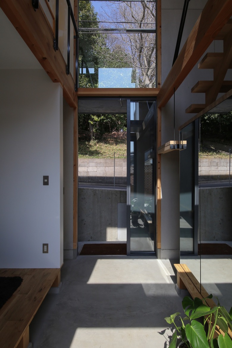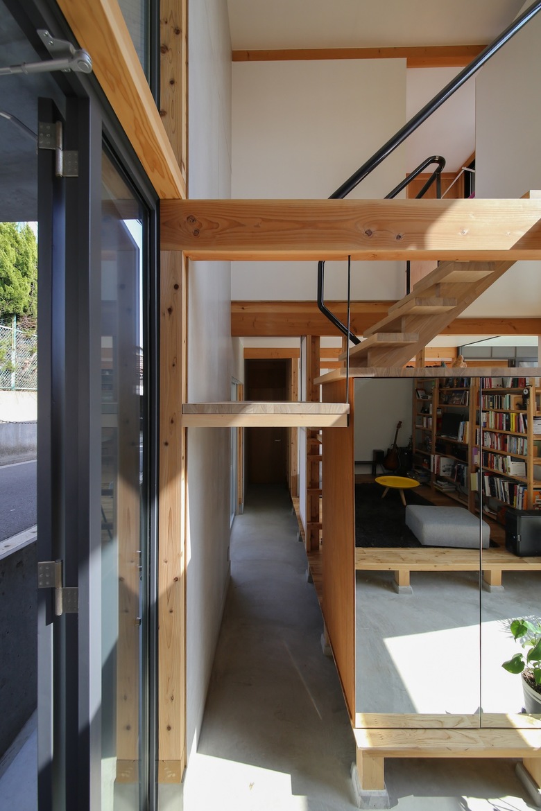 横浜の傾斜地に建つ住宅。不整形敷地に合わせて寸法を調整した門型の木造フレームを並べる。その間に回遊動線を計画し、住空間を作り出している。
