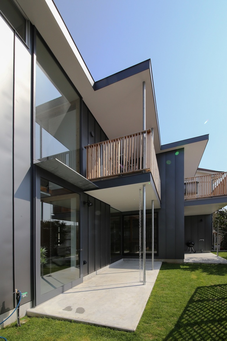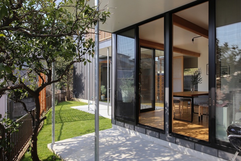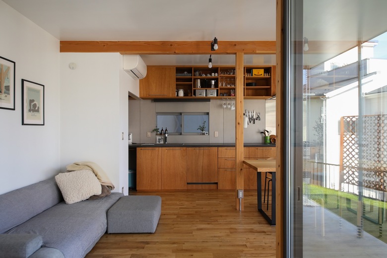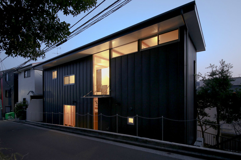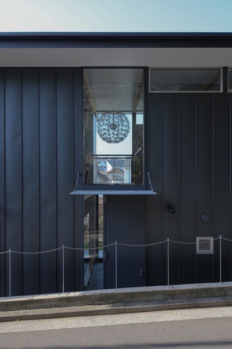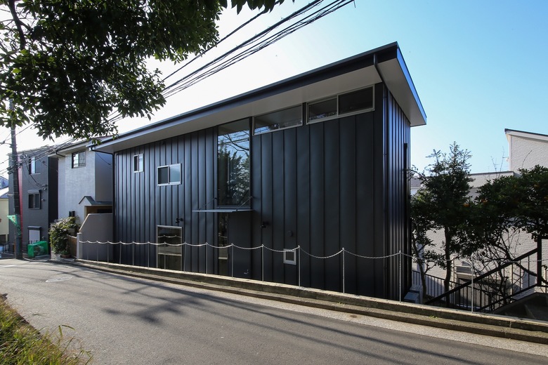 横浜の傾斜地に建つ住宅。不整形敷地に合わせて寸法を調整した門型の木造フレームを並べる。その間に回遊動線を計画し、住空間を作り出している。