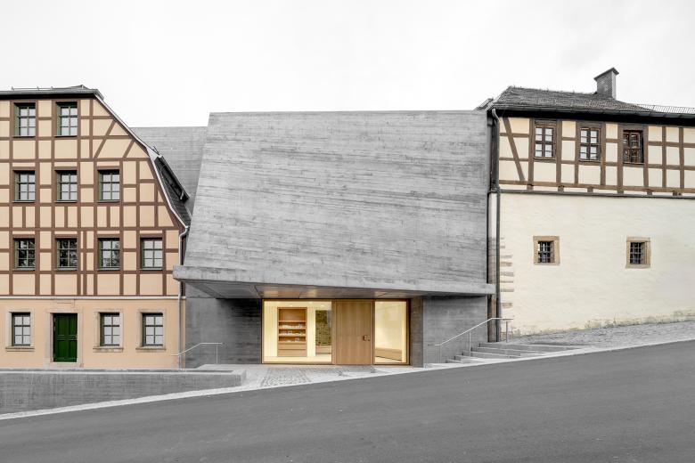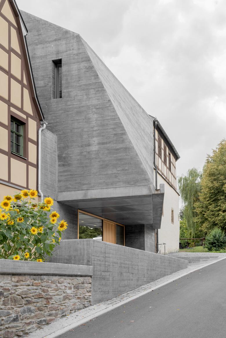 Die Altbauten, die rund vier Fünftel der Gesamtfläche ausmachen, werden durch die Verbindung mit dem Neubau erhalten und langfristig sinnvoll weitergenutzt. Der Neubau hat keinen Keller, um den Einsatz von Beton zu reduzieren. Die Räume der Gebäudetechnik befinden sich in einem der angrenzenden Altbauten. Die gekrümmte Fassade besteht aus einer materialminierten Beton-Hyparschale. Die Tragkonstruktion im Bestand wird mit Vollholz aus heimischen Wäldern verstärkt, ebenso werden für Fenster und Möbel heimische Hölzer verwendet.