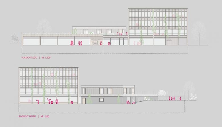 Vertikale Holzlamellen gliedern und strukturieren die Fassaden, dienen als Rankhilfe für die Begrünung und dienen dem außenliegenden Sonnenschutz. Alle Dachflächen werden extensiv begrünt und mit flach geneigten PV-Modulen in Pyramidenaufstellung in Ost-West Ausrichtung ausgestattet.