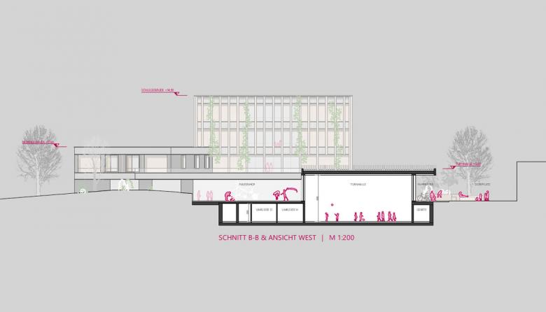 Im Erdgeschoss des Schulgebäudes sind Aufenthaltsbereiche für Pädagog:innen, Schulleitung und Verwaltung angesiedelt. Im 1. OG bietet ein Kreativbereich pädagogische Zusatzangebote und einen Dachgarten, der Einblicke in die darunter liegende Aula erlaubt. Die Klassenzimmer sind im 2. Und 3. OG angeordnet. Im nördlichen Schulgarten ist zudem eine Freiklasse geplant, die im Sommer den Schatten des Schulgebäudes genießt.