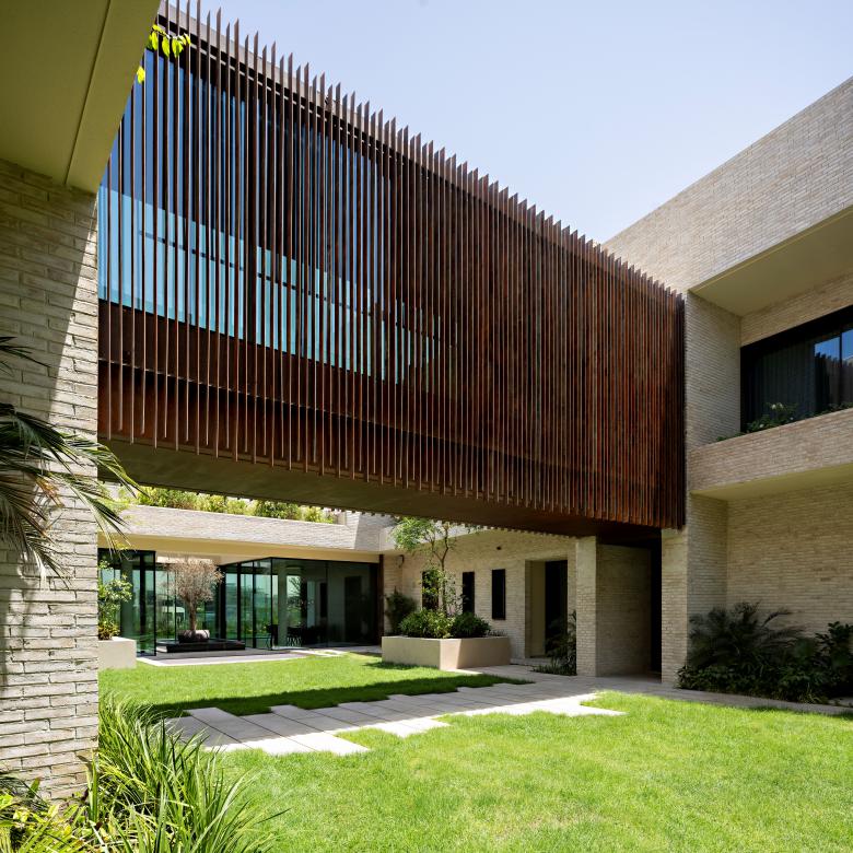 The envelope of the house responded with similar deliberation. A layered assembly of Peterson bricks as the key facade material, air cavities, and insulated blockwork coalesced into a silent system of resistance against heat gain. Planted roofs and perforated jaalis in weathering steel filtered light and dust, while water bodies and skylights choreographed an internal atmosphere that remained cool, luminous, and grounded.
