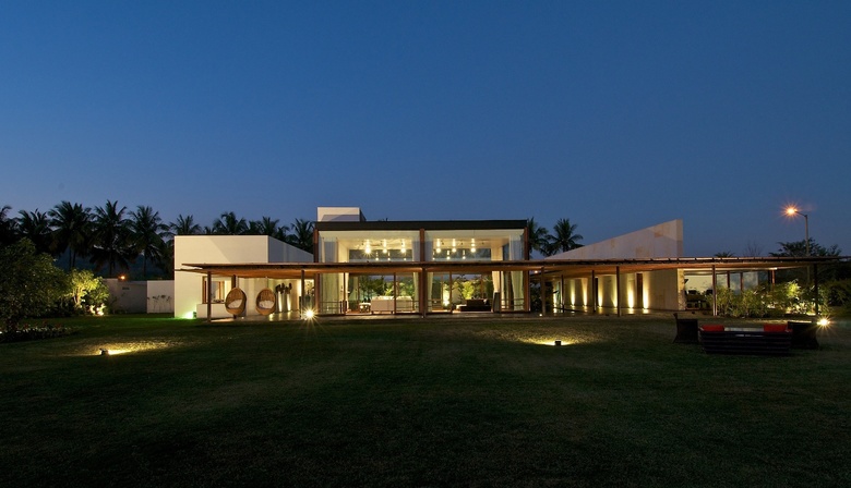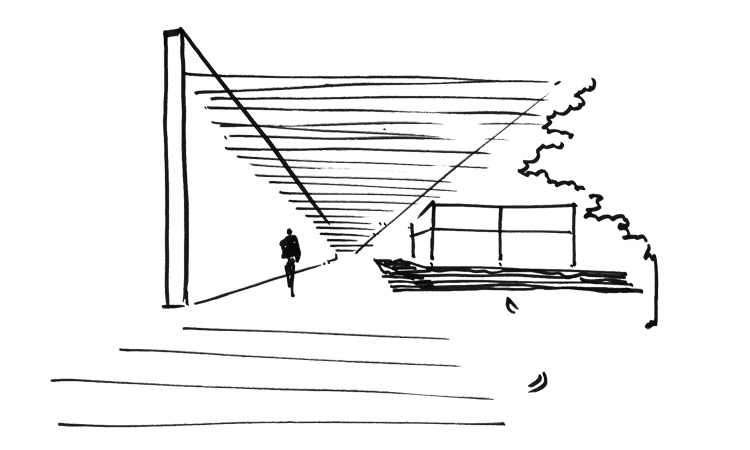 The living room, a counterpoint in the house, is a tall glass box which will throb with the flickering of the fireplace on cold evenings and will frame the changing hues of the sky as the sun sets.