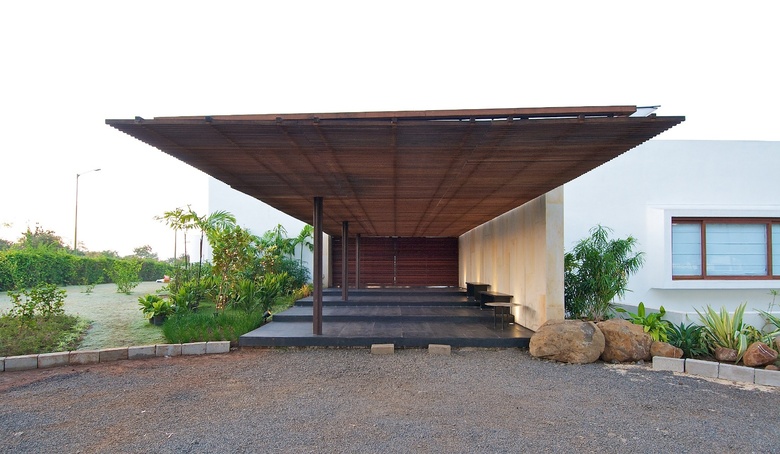 The verandah, with its timber lattice, sets a backdrop that negotiates between the enclosures and the central courtyard. This transitional space op dappled shade promotes a lifestyle in close connection with the outdoors.