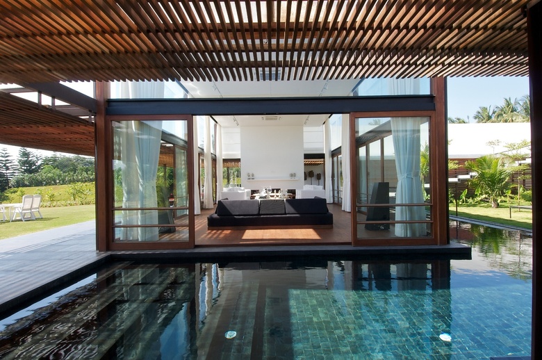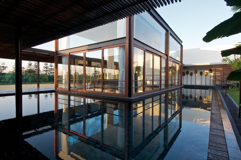 In the vast openness of the surroundings, it made sense to trap a mysterious forest of dense green by stringing the rooms around it, as a Shangri-La against the infinite. This courtyard allows for a private dip in the thicket of the lush vegetation.