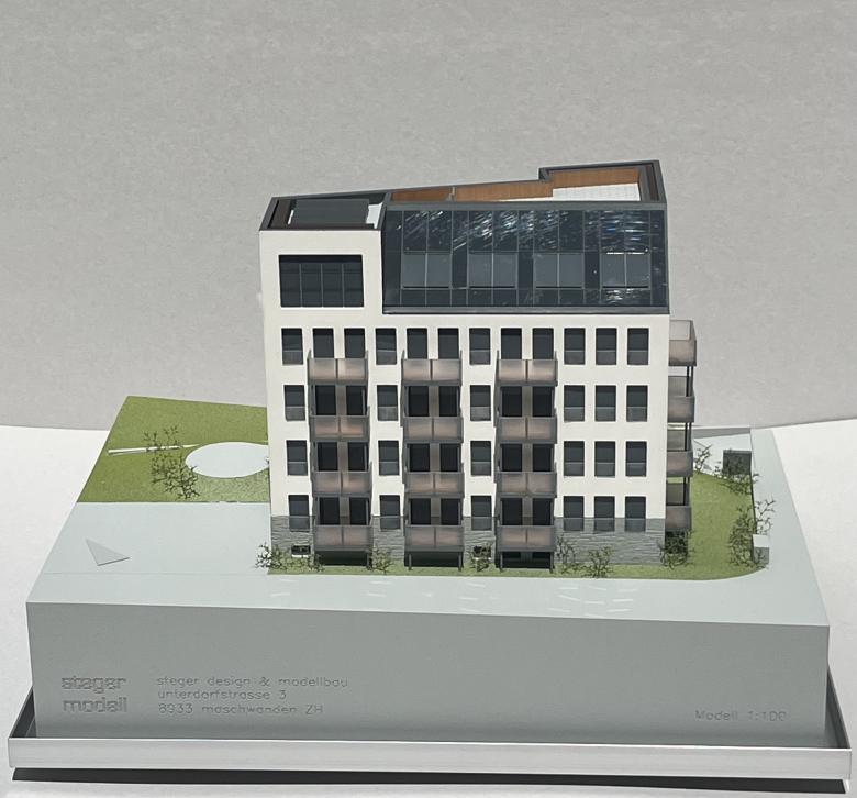 Farbiges Präsentationsmodell M 1:100 aus Kunststoff mit hinterlegten Acrylglasfenstern.