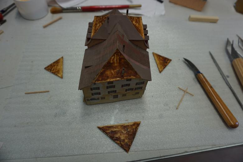 Die sehr detaillierten Gebäude ,welche zum Teil koloriert und mit farbigem Papier beklebt sind erfordern äusserste Sorgfalt bei der Reinigung und beim kleben der losen Teile. Die Reinigung erfolgt durch trockene, mit Granulat aufgetragene Behandlung. Diese entfernt sämtlichen Schmutz und Staub auf den filigranen Oberflächen.