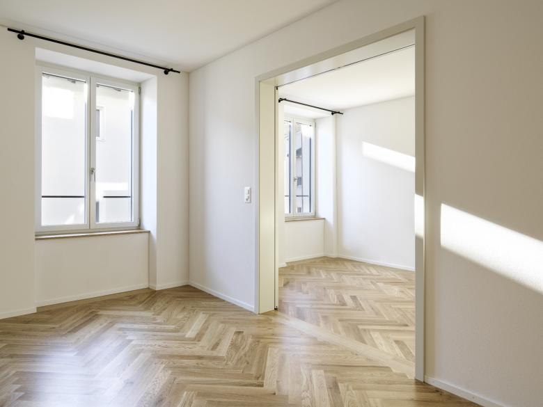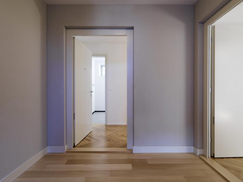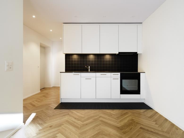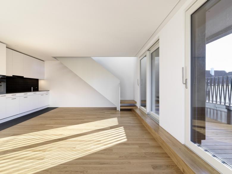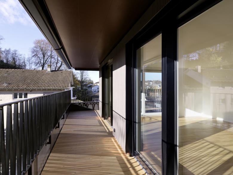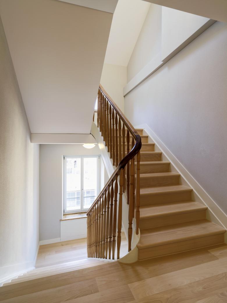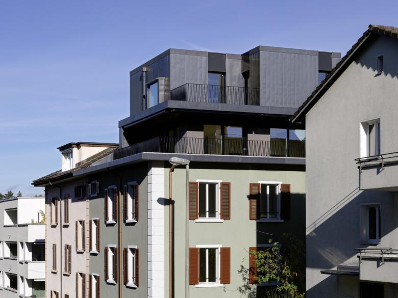 Ein charmantes Stadthaus wird, nebst einer Kernsanierung, mit einer zeitgemässen Aufstockung erweitert. Anstelle der früheren Vierzimmerwohnungen sind, jeweils auf einer Etage, neu zwei kleine Studiowohnungen organisiert. Der historische Charme des Gebäudes konnte weitgehend erhalten bleiben, obwohl die Qualität bezüglich Akustik und Haustechnik an die heute gültigen Anforderungen angepasst wurden. Das Haus ist heute mit einer Luft-Wasser Wärmepumpe ausgerüstet, welche mit einer Photovoltaikanlage betrieben wird. Der als Holzbau konzipierte Dachaufbau, ersetzt den alten Dachstock und fügt sich mit seiner klaren Volumetrie geschickt in die Dachlandschaft der Blockrandbebauung ein. Das Farb- und Materialkonzept lehnt sich an die Farbtöne des Altbaus an und erhält mit dem in braunem Kupfer gehaltenen Dachaufbau einen selbstbewussten Auftritt.