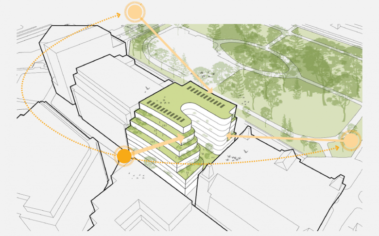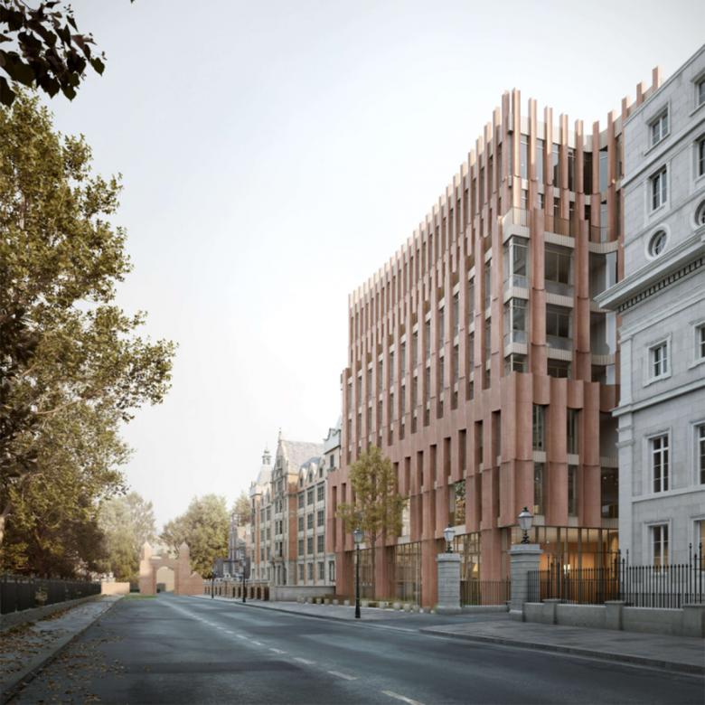 Facing the historic Lincoln's Inn Field, the north side of the building is expressed with a symmetrical and balanced façade in the manner of a palazzo. The façade is subtly curved in a soft gesture of urban embrace. The stepped massing, rising to nine stories, emphasizes rootedness and heft without overly imposing on its surroundings. South-facing outdoor terraces at multiple levels are capable of supporting planting, encouraging biodiversity and access to nature throughout the building for students and faculty to enjoy.