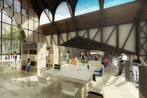 Los niveles superiores de las rampas ofrecen vistas de los tirantes de hierro y de las vigas de madera del techo del edificio original y hacia las galerías en los niveles inferiores. La expansión también incluye auditorios en una excavación subterránea y una librería cerca del techo.