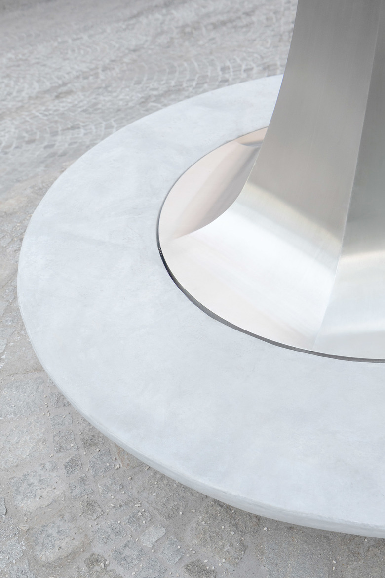 Die Skulptur erhebt sich auf eine Höhe von ca. 8,5 Metern und ruht auf einem flachen, runden Sockel, der den ehemaligen Standort des Brunnens am Hofberg kennzeichnet. Obwohl die Skulptur eine einfache und lineare Gestalt aufweist, ist die Form doch stark besetzt und lässt viel Interpretationsspielraum. Aus der Mitte eines Sockels entfaltet sich die Plastik mit einer langen senkrechten Stele und lädt durch die Ausbildung einer Sitzbank zum Verweilen ein.