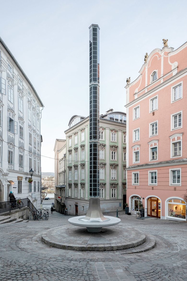 Photovoltaikpaneele speichern das Sonnenlicht und geben die Energie in der Nacht als Lichtpunkte wieder. Am Tag verändert der Schattenwurf den städtischen Raum, in der Dunkelheit verändert das Licht den umgebenden Raum. Mit Einbruch der Dämmerung lässt die Lichtsäule die technische Sachlichkeit und ihre geradlinige Formensprache vergessen und wandelt sich zum „Lichtbrunnen!"