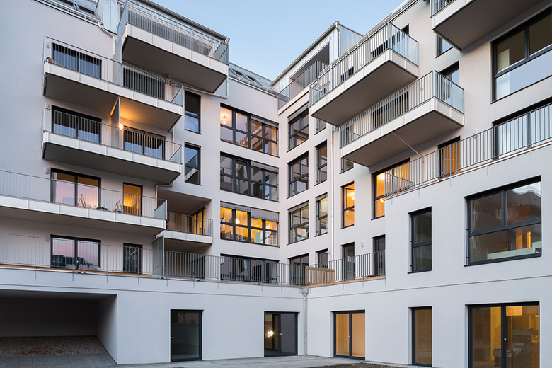 Die Fassadenöffnungen geben den Wohnungen durch außergewöhnlich viel Licht einen hohen Alltagswert und schaffen in der äußeren Erscheinung einen zeitgemäßen Maßstab. Während an den Straßenseiten gerade verlaufende Fassaden die Straßenräume klar definieren, entwickelt sich durch die stark gegliederte Hofseite ein differenziertes System unterschiedlicher privater Freiräume, die sich zum Innenhof hin öffnen. In den einzelnen Geschossen laufen versetzte Balkonflächen über die gesamte Gebäudebreite und erzeugen ein Wechselspiel aus Enge und Weite, Privatheit und Offenheit. Erschlossen werden sie durch raumhohe Fenstertüren, wodurch sich die Belichtungssituation der Wohnungen wesentlich verbessert.