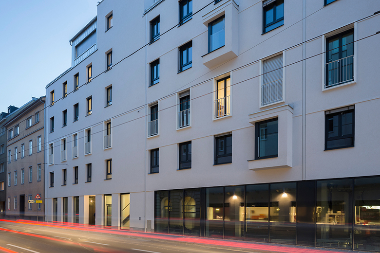In den übrigen Geschossen werden die Parapete auf Sitzhöhe konzipiert, um auch hier die Interaktion zwischen öffentlichem und privatem Raum zu fördern. Alle straßenseitigen Öffnungen sind in den Obergeschossen als doppelflügelige Fenster oder Fenstertüren ausgeführt. Damit wird ein funktionelles Optimum erreicht: Fenster, die bei geöffnetem Zustand nur unwesentlich in den Raum ragen und leicht zu reinigen sind.