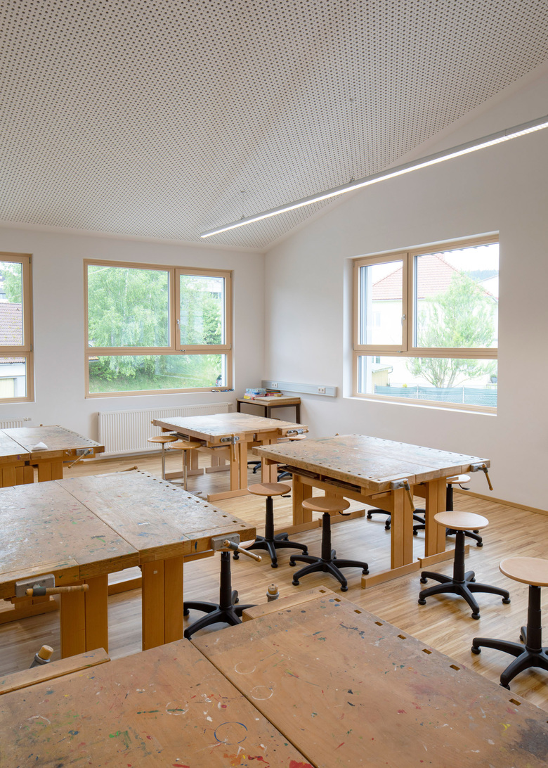 Die Klassenräume bilden die äußere Schicht, in der Mitte liegen die Neben- und Nassräume, während sich zu den Glasfronten an der Stirnseite die freien Bereiche für den Pausenaufenthalt orientieren. Im Obergeschoß öffnet sich der neu errichtete Bereich bis unter die Dachsilhouette und bildet durch seine farbliche Gestaltung eine optisch abgetrennte Lernlandschaft mit großzügigen Luftraum. - "Alle Klassenräume münden direkt in die Marktplätze!" - der untere Gruppenraum lässt sich darüber hinaus mit seiner großzügigen Verglasungen direkt mit den Freibereich verbinden.