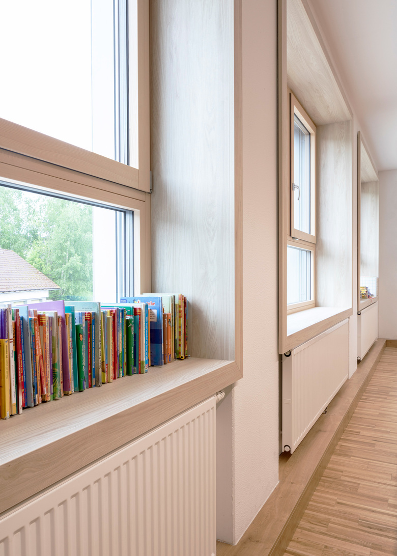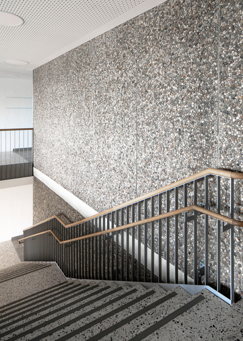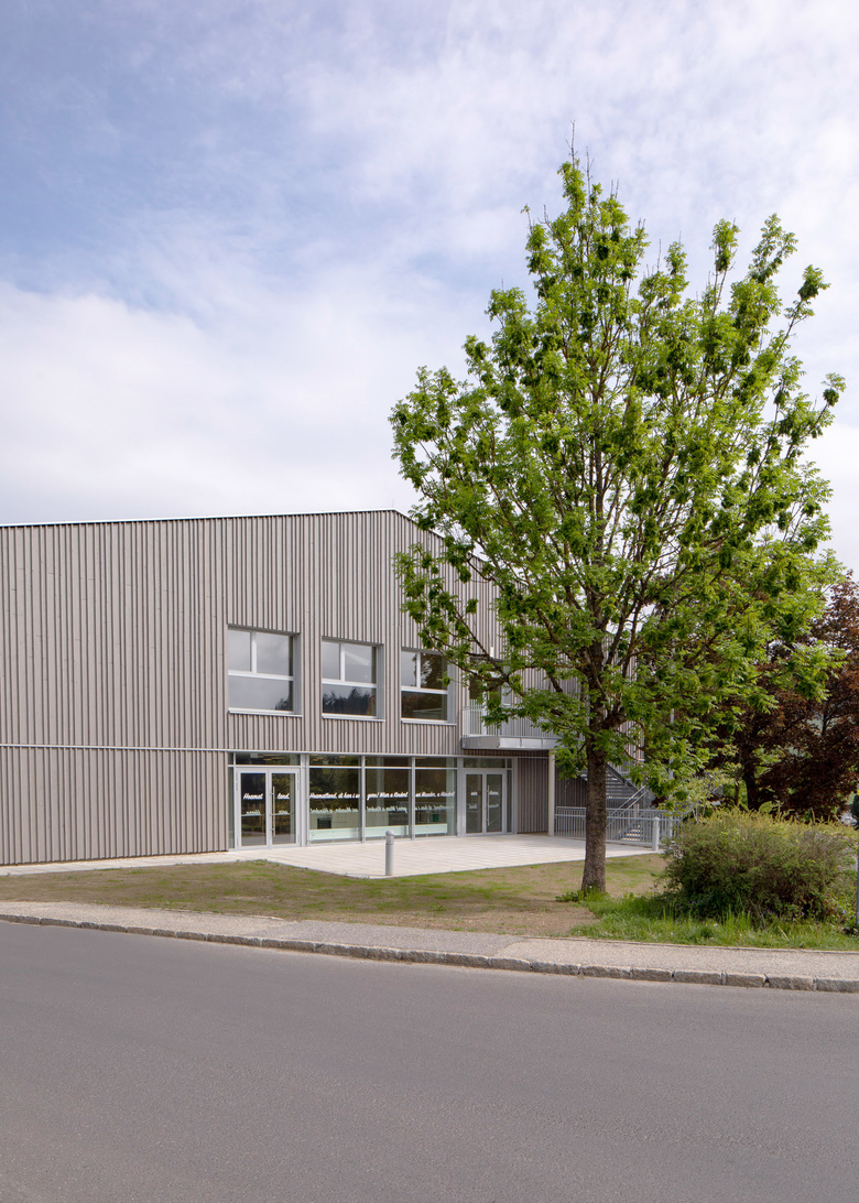 Die bestehende und durch Vor- und Rücksprünge gekennzeichnete Baukörpergliederung konnte durch die notwendigen räumlichen Erweiterungen in einer neuen und schlichten Gebäudehülle zusammengefasst werden. Ohne großer Gestik verbindet sich nun das Zusammenspiel von Alt und Neu und bildet durch die vorgehängte Holzfassade eine ruhige aber selbstbewusste Gebäudehülle.