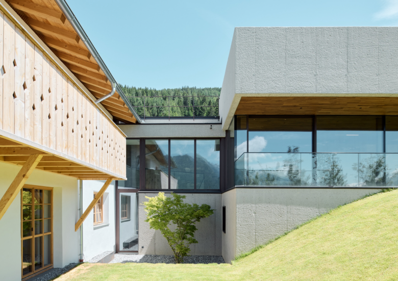 Dieses Projekt setzt gezielt auf den Kontrast zwischen Tradition und Moderne, um ein harmonisches Zusammenspiel zu schaffen. Der denkmalgeschützte Mittelteil des Gebäudes bewahrt seine historische Authentizität, während ein minimalistischer Neubau aus gestocktem Sichtbeton mit klaren Linien und zeitgemäßen Materialien das Ensemble ergänzt.