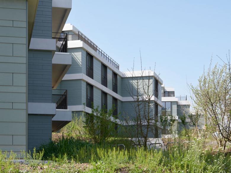 Die Wohnüberbauung liegt auf einer Hügelkuppe im Südosten der Gemeinde Gossau ZH. Vier kompakte Baukörper stehen leicht zueinander verdreht, wodurch das angrenzende Waldstück sichtbar bleibt und der Grünraum zwischen den Häusern in die Siedlung hineinfliessen kann. Die als Vierspänner konzipierten Häuser enthalten je rund zehn Eigentumswohnungen, wobei jede Wohnung über eine dreiseitige Orientierung verfügt. An den Süd gerichteten Gebäudeecken liegen grosszügige Balkone, flankiert von den Küchen und Wohnzimmern, die im Innern eine Übereck-Komposition bilden. Helle Betonbänder zeichnen die Geschossdecken nach und sorgen für eine horizontale Struktur.