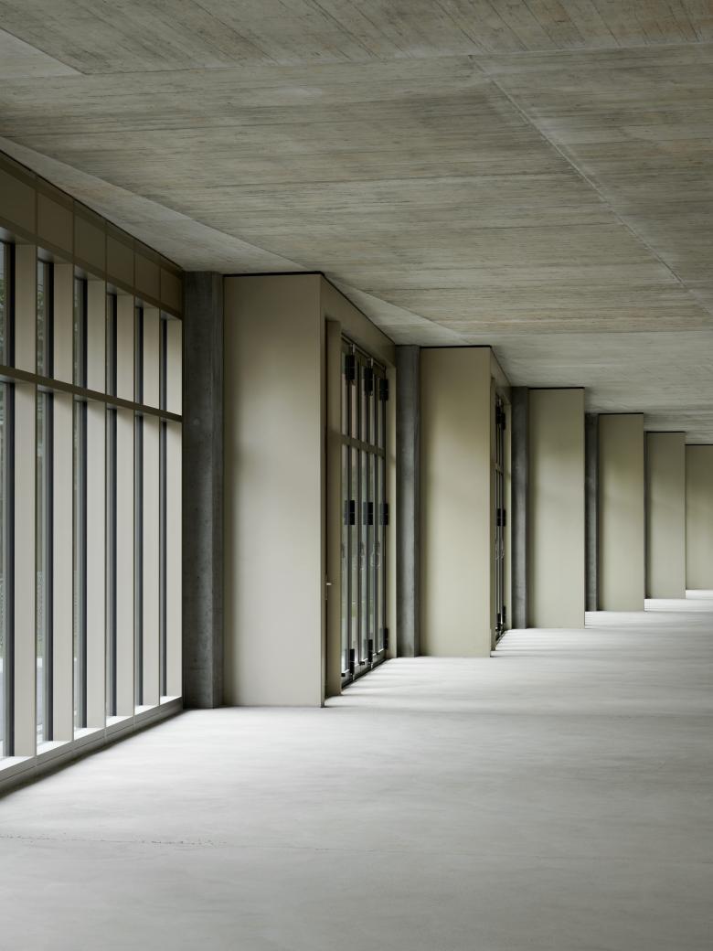 «B2Binz» prägt den Auftakt zum Gewerbegebiet Binz im Süden der Stadt Zürich. Der lange Baukörper erstreckt sich vom Bahnhof im Norden bis an die Grubenstrasse im Süden, wo die schmale Stirnfassade in die Höhe ragt. Lange Bandfenster laufen rund um das Gebäude und betonen im Wechseltakt mit den blechverkleideten Brüstungen die Horizontale. Die abgetreppte Ostfassade vermittelt zwischen den grossmassstäblichen Gewerbebauten im Westen und der angrenzenden Wohnsiedlung. Gleichzeitig generieren die vorgelagerten Volumen attraktive Terrassen für die ab dem vierten Obergeschoss angesiedelten Dienstleistungsbetriebe. Die unteren Geschosse sind dem produzierenden Gewerbe vorbehalten.