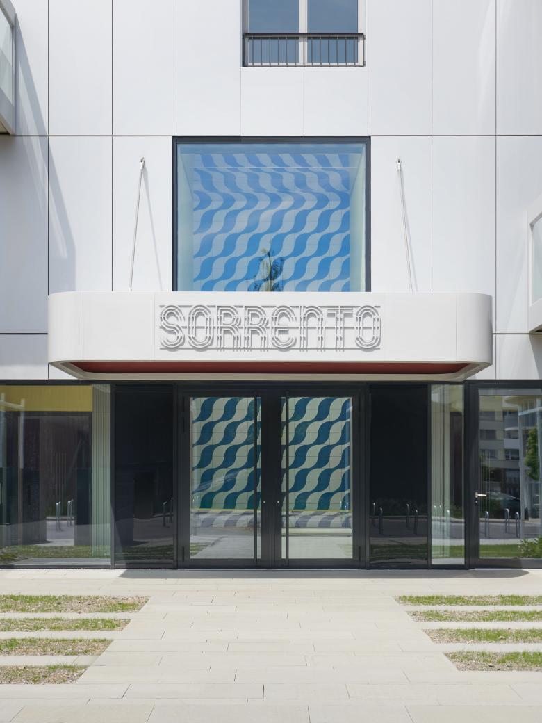 Das Eingangsgeschoss ist durchlässig und sowohl von der Quartierstrasse im Osten als auch von der Langsamverkehrsachse im Westen, die entlang der Bahngleise verläuft, zugänglich. Im «Sorrento», dessen Namen an einen ebenfalls hell in Erscheinung tretenden Hotelbau in Miami Beach erinnert, wird vom Erdgeschoss bis ins 20. Obergeschoss gewohnt. Die 116 kompakten Mietwohnungen richten sich an ein junges Publikum. Im Gegensatz zu den zurückhaltend gestalteten Wohnungen zeichnen sich die halböffentlichen Erschliessungsräume durch eine kräftige Farbgebung aus, wie sie auch für das Miami der 1950er-Jahre oder die damals entstandene Pop Art typisch ist. Ein ausladendes Vordach und eine durch farbige Muster und Spiegel geprägte Eingangshalle heissen die Bewohnerinnen und Bewohner willkommen.