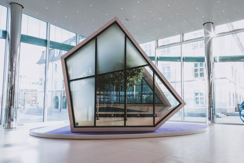 Wie ein herausgeschnittenes Fragment einer hochmodernen Holzarchitektur steht dieser als skulpturales Objekt im Merck Innovation Center in Darmstadt.